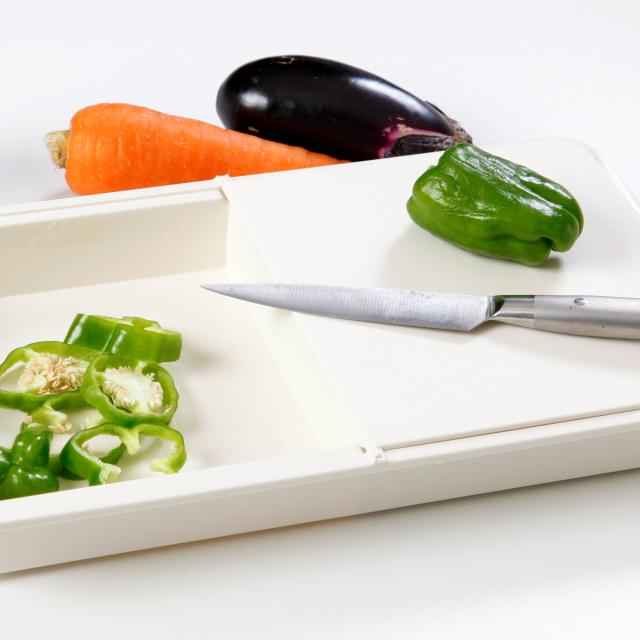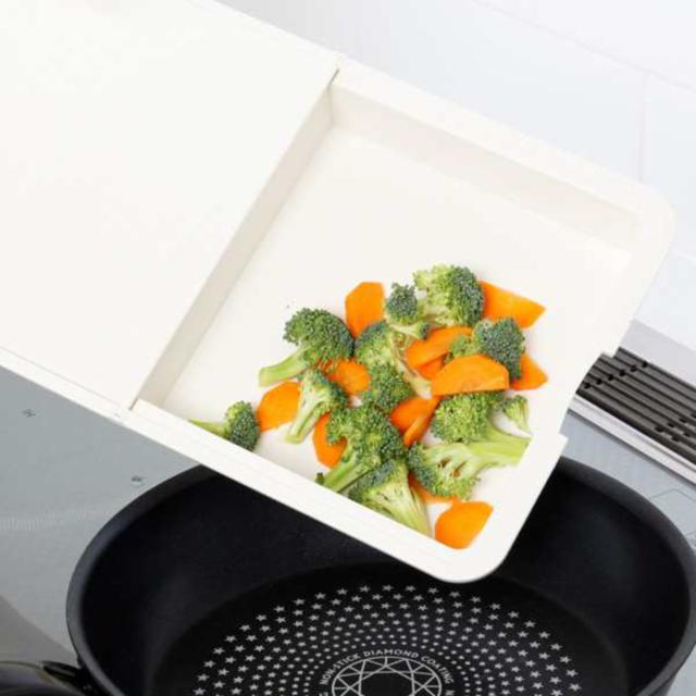 切った食材をスライドさせてトレー面に落とし、そのままフライパンに移すことができます。また、切った後の野菜の皮などをスライドさせてトレーに移し集めておくことでテンポよくお料理ができ、後の片付けも簡単です。