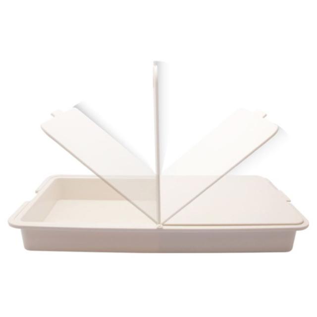 まな板を「パタンッ」と左右に動かすだけで使い分けができ、片面はザルもう片面はトレー仕様になっています。裏面にはすべり止めゴム付きなので安定してお使いいただけます。