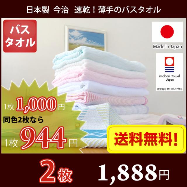 バスタオル 日本製 今治 乾きが早い薄手のバスタオル 同色2枚セット 【メール便送料無料】【圧縮パック】