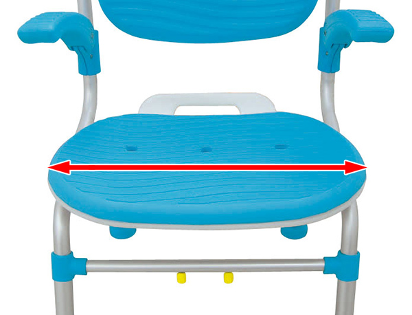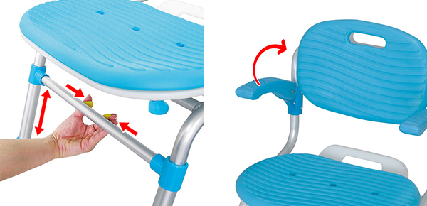 | 座面高さ調節ワンタッチ ツマミを寄せて、パイプを上下させるだけで簡単に高さ調節ができます。パイプは2本が連動するので、前後2回の調整で済みます。床に置いたままでもスムーズに調整ができます。 | 可動式の肘かけ付き 肘かけは上下するので、体位が変えやすく洗浄時邪魔になりません。また、浴槽とのすき間が少なくなりスムーズに出入りができます。 |