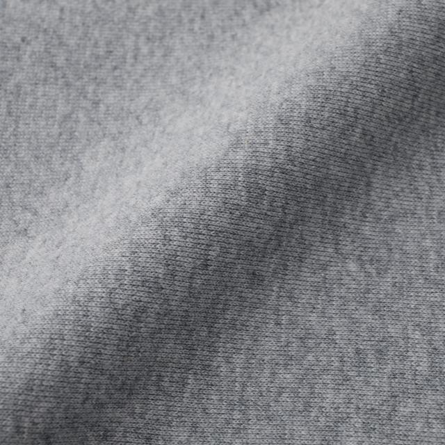 表面はオープンエンド糸特有のザラ感のあるざっくりした風合い、乾いた硬い肌ざわりの厚手生地が特徴。