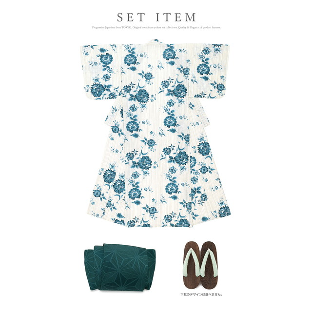 こちらの商品は、浴衣・帯・下駄の3点セットです。セット内容の一部変更や、それに伴う値引きは承っておりません。