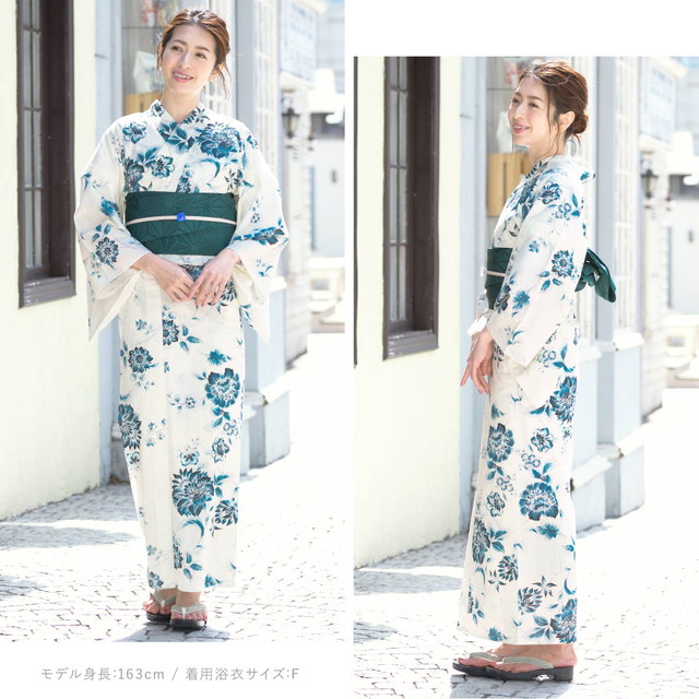 即納【レディース浴衣3点セット】浴衣セット/レディース/白/ホワイト/青/ブルー/花更紗/花/綿/30代/40代/女性/S・フリー/大人/送料無料/2020夏新作