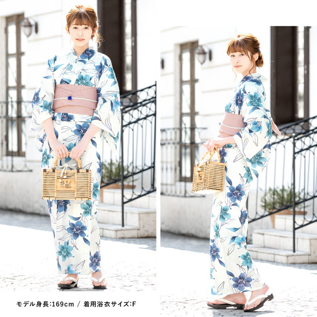 浴衣セット レディース レトロ 浴衣セット 大人 3点セット 白 ホワイト 青 ブルー 百合 花 フラワー 吸水速乾 CoolPass 夏祭り 花火大会 女性用 S・フリー