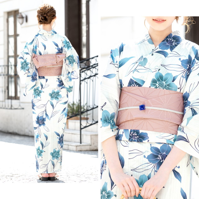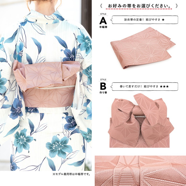 帯は、体に巻いて後ろで結ぶタイプの半幅帯、又は作り帯からお選び頂けます。モデル着用は半幅帯です。