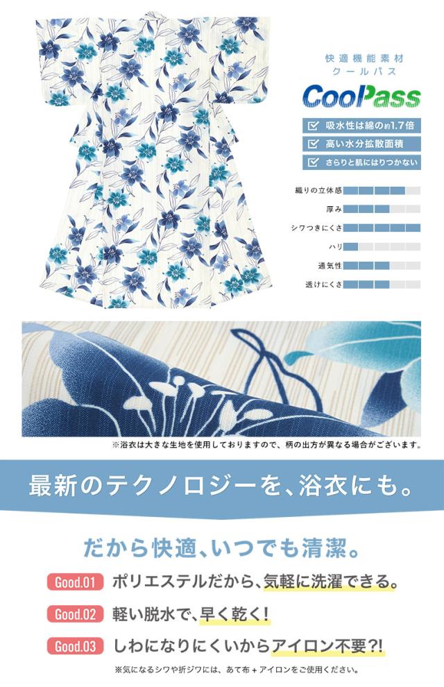 浴衣生地は、ひんやりとした肌触りのポリエステル100%で、吸汗性と速乾性の繊維のCoolPassを使用しています。