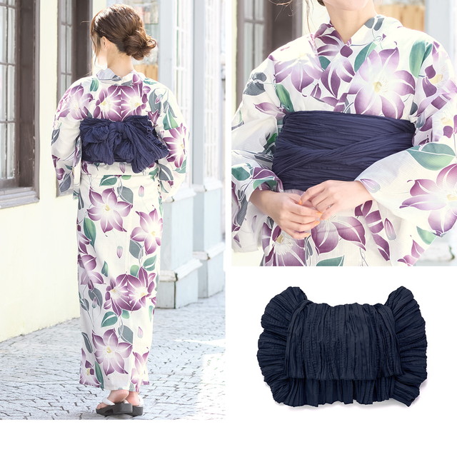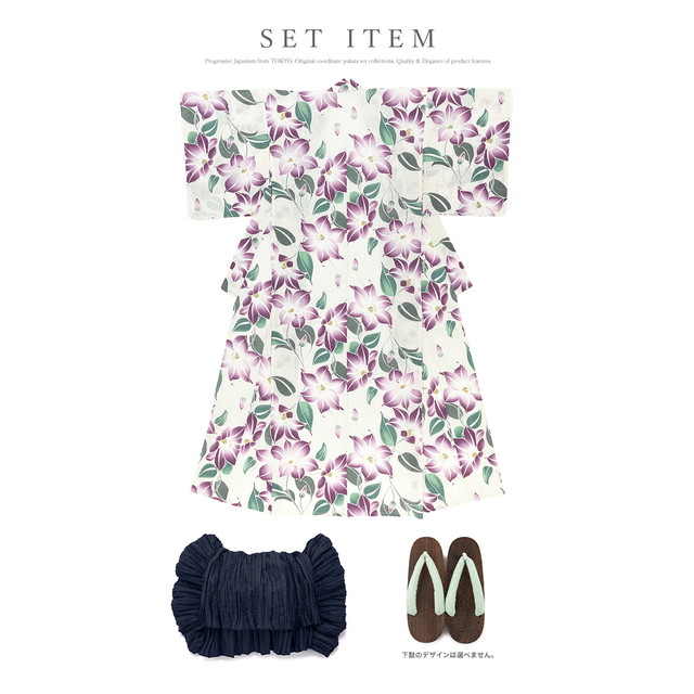 こちらの商品は、浴衣・帯・下駄の3点セットです。セット内容の一部変更や、それに伴う値引きは承っておりません。