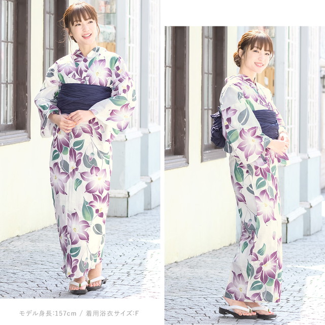 即納【レディース浴衣3点セット】浴衣セット/レディース/白系/紫/クレマチス/花/綿/絽/変わり織り女性セゾン/フリー/大人/送料無料/2020夏新作