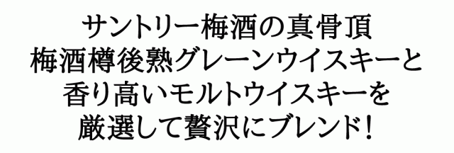 サントリー梅酒の最高峰!複数のウイスキーを贅沢にブレンド!ウイスキーの古樽の内面を焙煎し、梅酒をゆっくりと熟成させた後、梅酒樽後熟グレーンウイスキーと、香り高いモルトウイスキーを厳選して贅沢にブレンド。焙煎樽熟成梅酒と複数のウイスキーが織りなす複層的な香り、深く長い贅沢な余韻。甘さ控えめながらも、香り立ち華やかで贅沢な味わい。ちぎり加工を施した和紙調の紙を使用し、梅酒の筆文字は書家荻野丹雪氏の書。リッチで深みのある味わいをウイスキー愛好家にもぜひご賞味いただきたい逸品です。