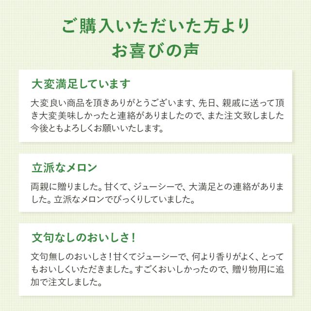 - しっかりした立派な箱を開けて、立派なメロンに驚きました。こんな状況でもとても良い品をありがとうございました。到着後1週間頃ひとつ食べて、味も熟成もちょっと残念な内容だったようです。あとひとつはもう少し...