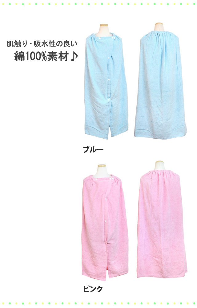 | 商品説明 | プールタオル 水泳タオル ビーチタオル スイミングタオル 着替えタオル ラップバスタオル 子供 水着 プール(スイミング教室など)や海水浴での着替えに大活躍 スナップボタン付きバスタオルです 表地は肌触りの良いシャーリング加工 前面スナップ止めは5箇所 ゴムの入った上部はスナップボタンでサイズ調整が可能です 内側にネームタグ付き |