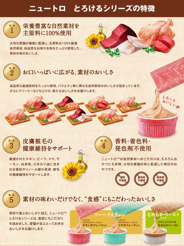 ・ニュートロが選ぶ原材料は全てに意味があります。厳選した自然素材ひとつひとつが本来もつ、おいしさや栄養素を活かした製品づくりを通じ、おやつでも愛猫の健康維持をサポートします。