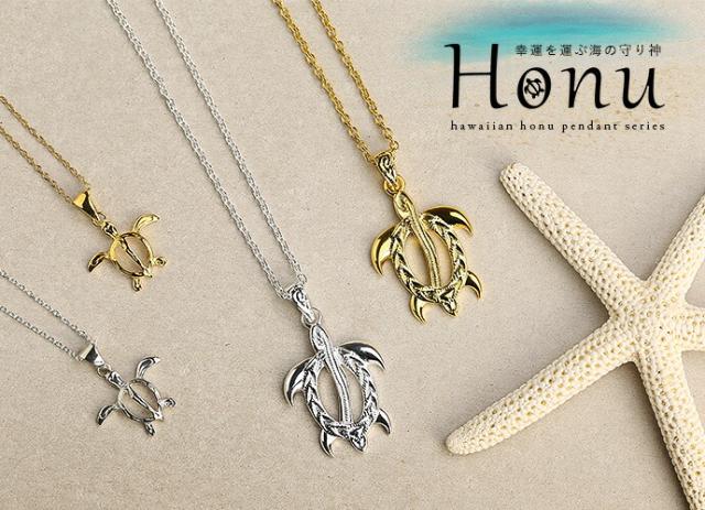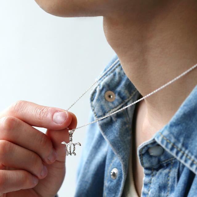 小振りサイズがかわいらしい、ホヌ(海亀)型のペンダント。ハワイでは古来よりホヌを神様の使い・幸福を運んでくる「海の守り神」として大切にしてきました。幸福や繁栄の象徴としてハワイアンアクセサリーでも人気のモチーフの1つです。お守り代わりに着けるはもちろん、ペアアクセとして着けるのもオススメです。