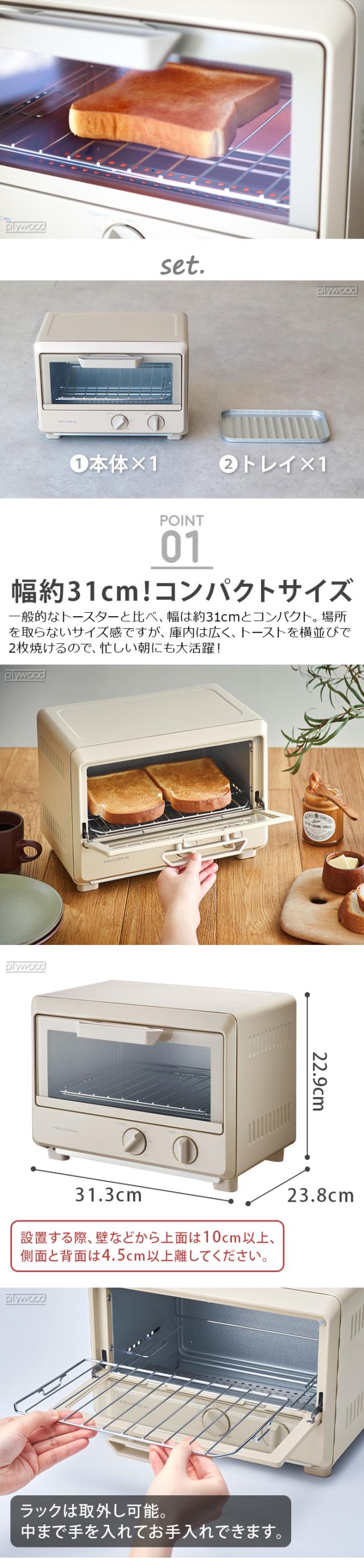 | ・食パン2枚同時焼き ・温度調節ダイヤル(80〜230℃) ・タイマーダイヤル(最長15分) ・Webカードレシピ付き(QRコード) |