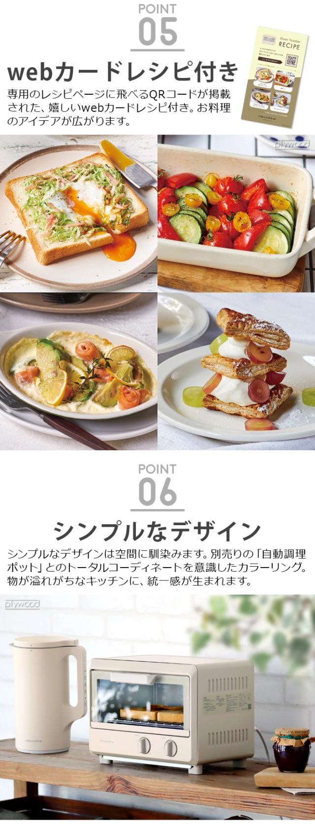 ダイヤルを回すだけのシンプルな操作性。上下に設置されたヒーターは最大1000Wとパワフル!温度は80〜230℃まで、タイマーは最長15分まで無段階設定できるので、メニューに合わせて焼き加減が調節可能です。スコーンやピザなどのオーブン料理に便利なトレイと、お手入れも簡単なパンくずトレイ付き。レシピページにアクセスできる、webカードレシピ付属。