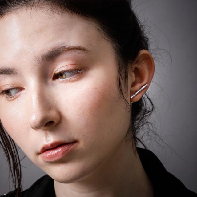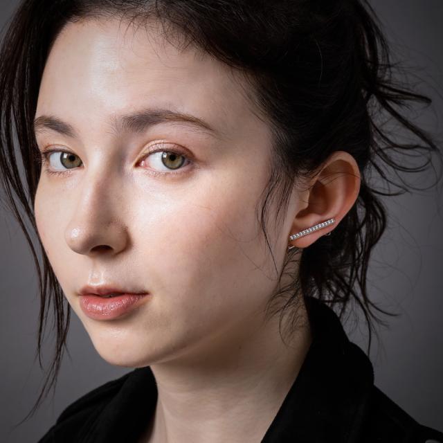 耳に沿って上がるバーがシンプルで現代アートを思わせるシルエット。