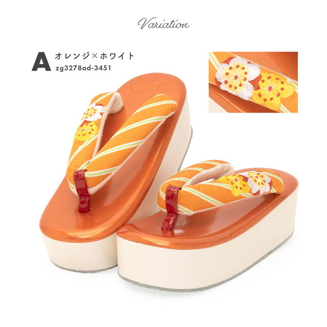 エナメル加工した天に、ストライプの生地に桜の花の刺繍が施された鼻緒が挿げられています。