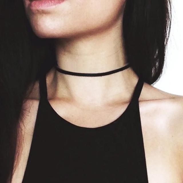 首にタイトに巻くネックレス。