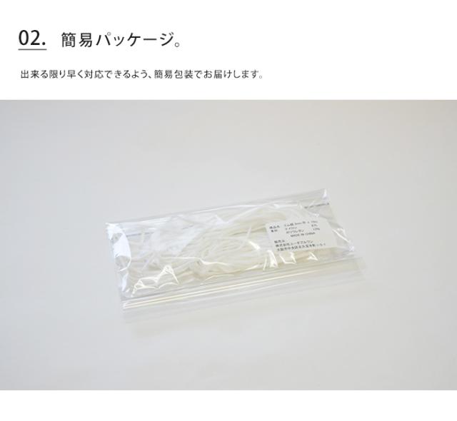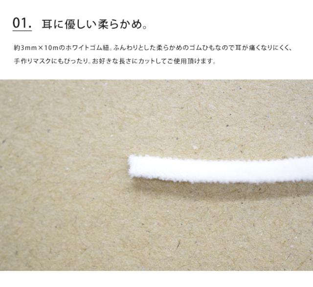 約3mm×10mのホワイトゴム紐。ふんわりとした柔らかめのゴムひもなので耳が痛くなりにくく、手作りマスクにもぴったり。お好きな長さにカットしてご使用頂けます。出来る限り早く対応できるよう、簡易包装でお届けします。