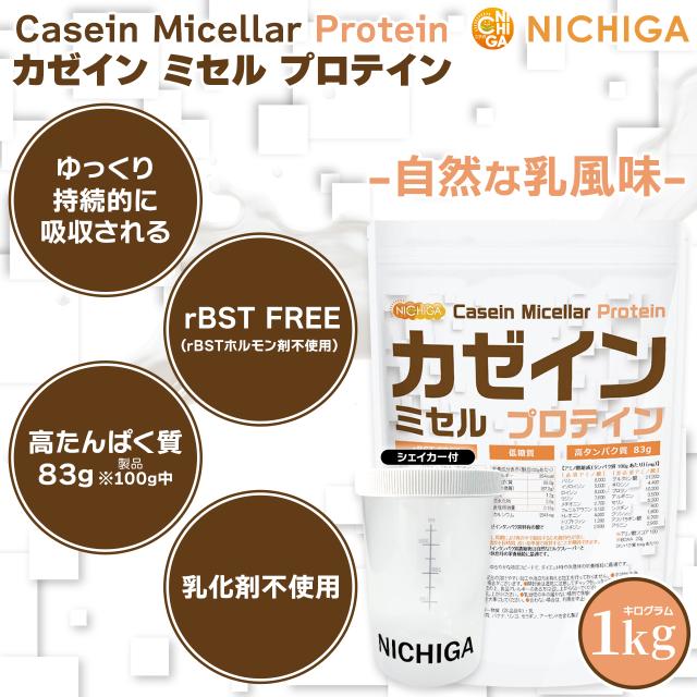 <シェイカー セット> カゼイン ミセル プロテイン 1kg【送料無料(沖縄を除く)】 Casein Protein プレーン味 高タンパク質 低糖質 乳化剤不使用・甘味料不使用・香料不使用 NICHIGA(ニチガ) TK1