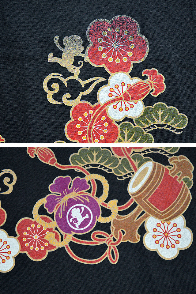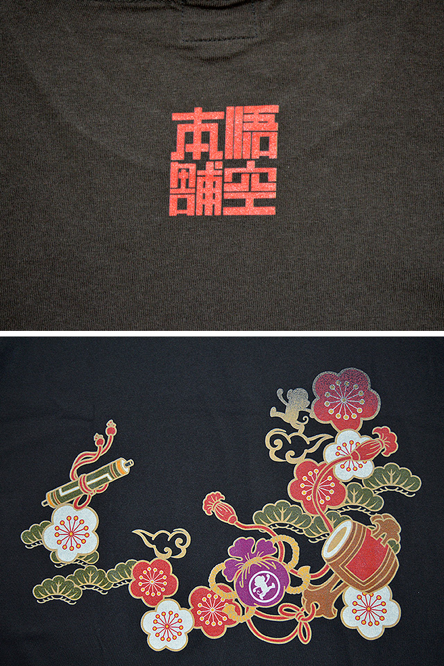 元気いっぱいの走りサルをメインキャラクターに、バリエーション豊富なアイテムを展開し続ける【GO-COO!!】さんから、「悟空2連フェイクポケット半袖Tシャツ(GST-1115)」のご紹介です。 ポップなアメカジテイストのデザインあり、和柄なのに和っぽくないデザインあり、 背中には打ち出の小槌や松竹梅など、縁起の良いモチーフをデザイン。 | |||||||||||||||||||||||||