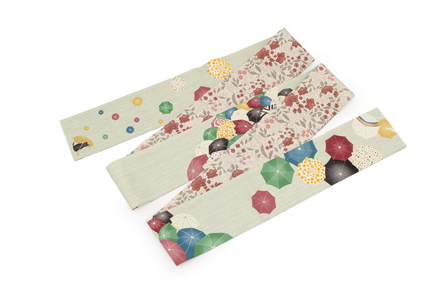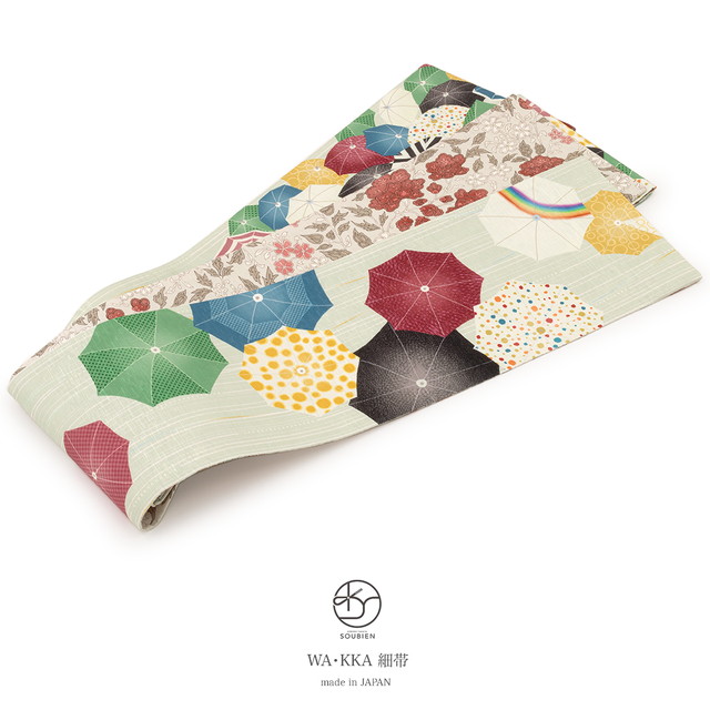 半幅帯 リバーシブル WA・KKA 浴衣 帯 夏向き 両面 2way 薄緑 カラフル 傘 花唐草 更紗 正絹 一輪館 カジュアル 女性用 レディース 細帯 半巾帯 仕立て上がり 送料無料