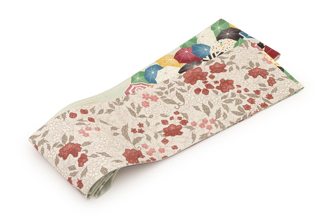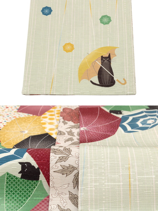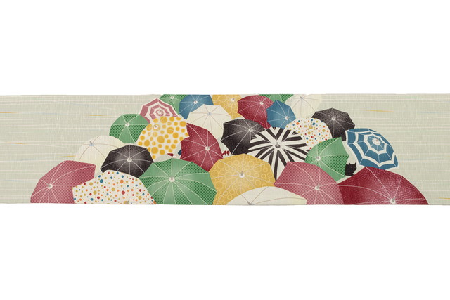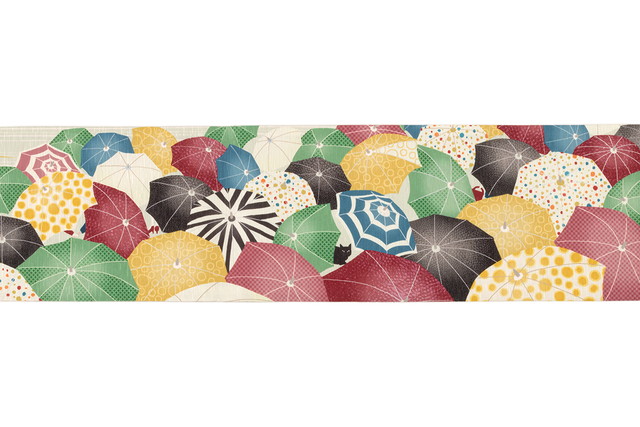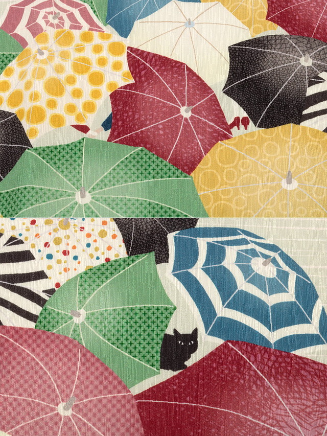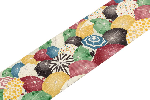 紬のようにも見える地模様の生地に、片面はさまざまな模様が施された傘が鮮やかな色彩で描かれた、レトロ可愛いデザインです。