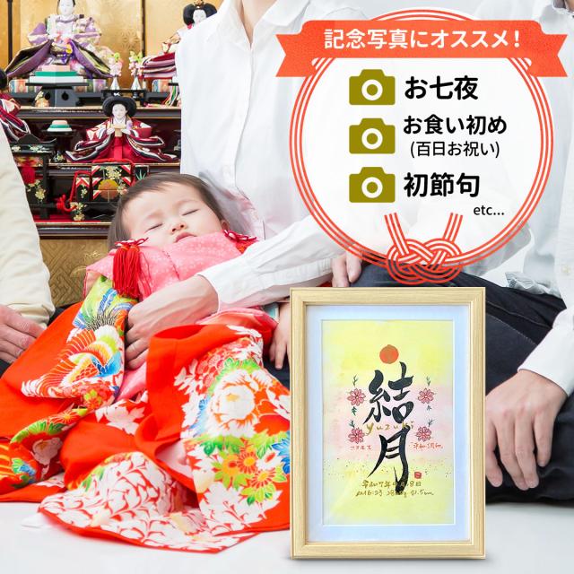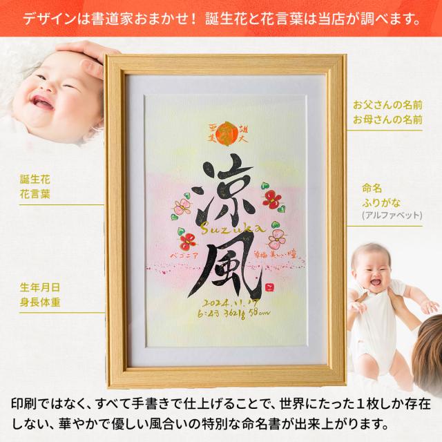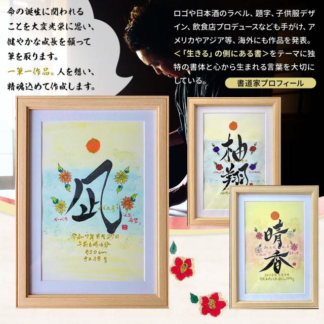 可愛くなりすぎない書体とデザインなので、大人の方へのギフトにも大好評! お子様の誕生祝いとして、ご家族、ご親戚、ご友人、おじいちゃんおばあちゃんから…それぞれのお祝いや感謝の気持ちを、世界でたったひとつしかない書の作品にしたためました。書道家が1枚1枚直筆で手がける、完全おまかせオーダーメイド、正真正銘の一点ものです。 生年月日、身長体重、命名にアルファベットのふりがな。これに366日の誕生花と花言葉を添えて、いつまでもご家族の皆様に愛される命名書を制作いたします。一生の大事な記念品にいかがでしょうか。 親からお子さんへの人生最初の贈りものである”名前”。明るい未来に向けて力強く、たおやかに揮毫(きごう)いたします。 |