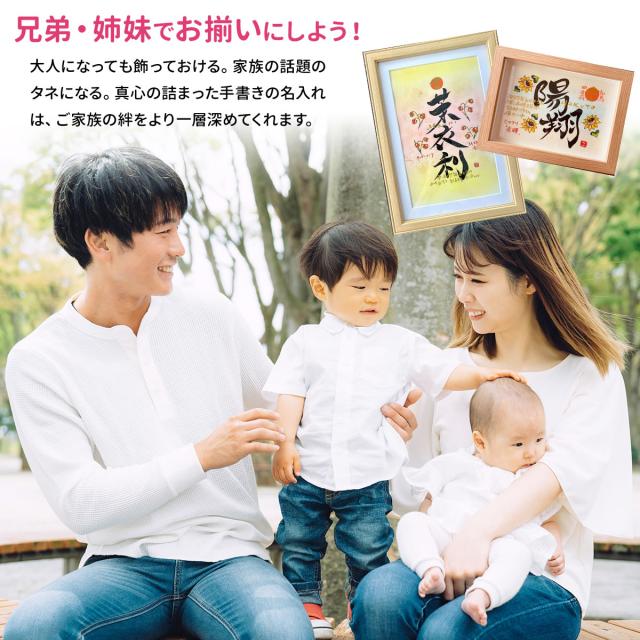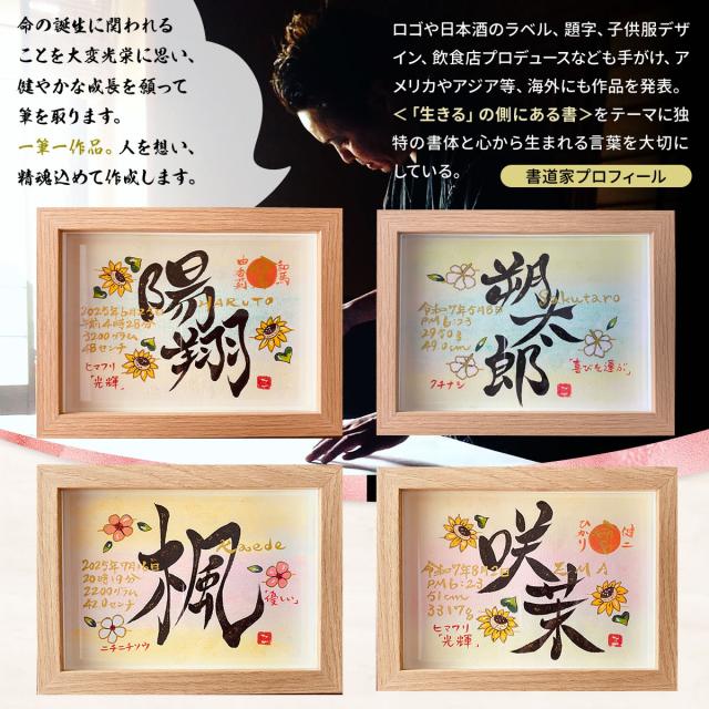 可愛くなりすぎない書体とデザインなので、大人の方へのギフトにも大好評! お子様の誕生祝いとして、ご家族、ご親戚、ご友人、おじいちゃんおばあちゃんから…それぞれのお祝いや感謝の気持ちを、世界でたったひとつしかない書の作品にしたためました。書道家が1枚1枚直筆で手がける、完全おまかせオーダーメイド、正真正銘の一点ものです。 生年月日、身長体重、命名にアルファベットのふりがな。これに366日の誕生花と花言葉を添えて、いつまでもご家族の皆様に愛される命名書を制作いたします。一生の大事な記念品にいかがでしょうか。 親からお子さんへの人生最初の贈りものである”名前”。明るい未来に向けて力強く、たおやかに揮毫(きごう)いたします。 |