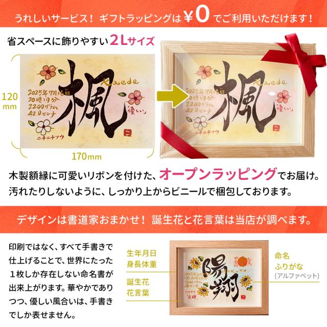 命名書 命名紙 オーダー 代筆 かわいい おしゃれ 用紙 額 台紙 手書き 出産祝い 男の子 女の子 名入れ プレゼント 赤ちゃん ベビーギフト お七夜 名前入り ギフト 記念品:世界でひとつ!誕生花のイラスト入り 命名書(2Lサイズ)