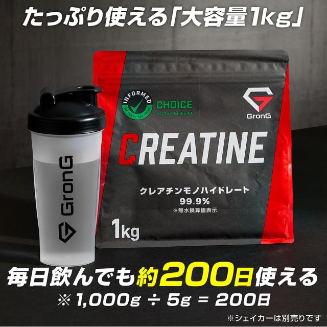 グロング クレアチン モノハイドレート パウダー 1kg 200食分 人工甘味料不使用 甘味料不使用 creatine monohydrate サプリ 高純度99.9%