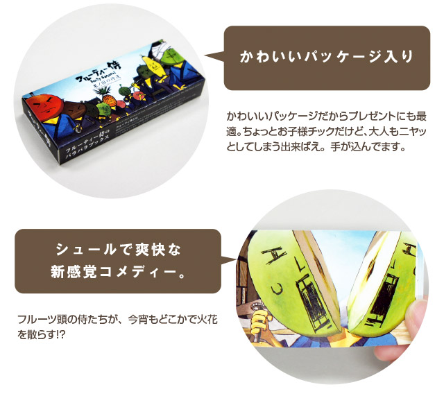 フルーティー侍とは: 福岡のアニメーションスタジオhappyprojectから誕生したショートアニメ。2009年にYouTubeで公開後、国内外の映画祭で受賞を重ね、2013年シリーズアニメ化。アニメ専門チャンネル・キッズステーションでの放送を経てDVD&書籍化。