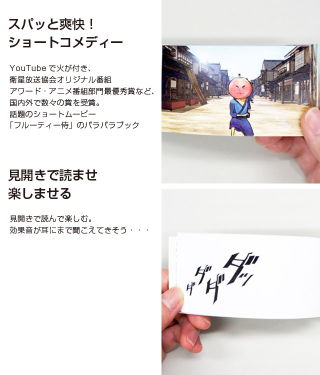 YouTubeで火が付き、衛星放送協会オリジナル番組アワード・アニメ番組部門最優秀賞など、国内外で数々の賞を受賞。話題のショートムービー「フルーティー侍」のパラパラブックが2冊同時に登場。 シュールで爽快な新感覚コメディー。 フルーツ頭の侍たちが、今宵もどこかで火花を散らす!?