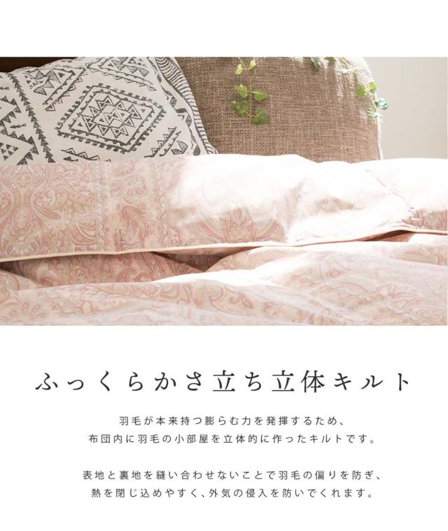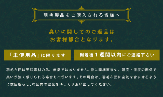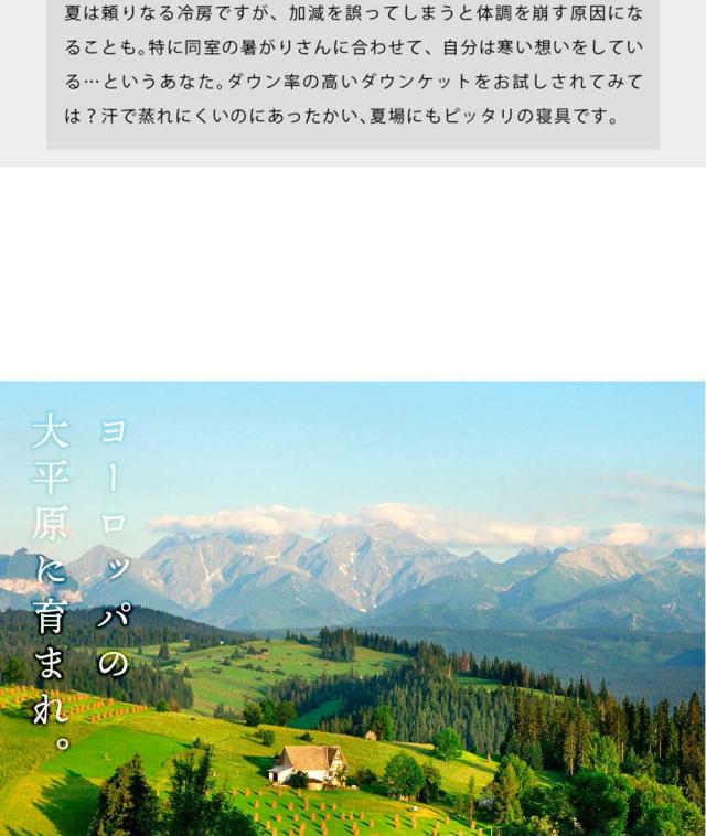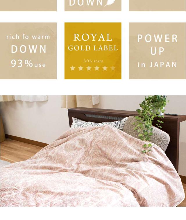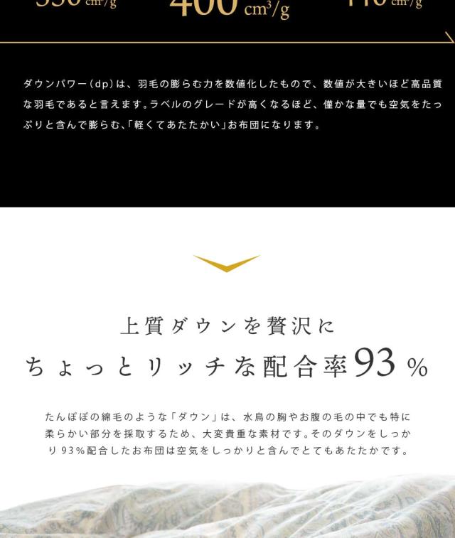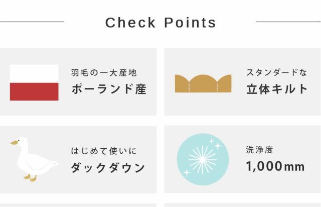 | 仕様 | 立体キルト マス目(4×5) ループ8ヵ所 ポーランド産ホワイトダックダウン使用 詰め物重量0.3kg 400DP以上 ロイヤルゴールドラベル |