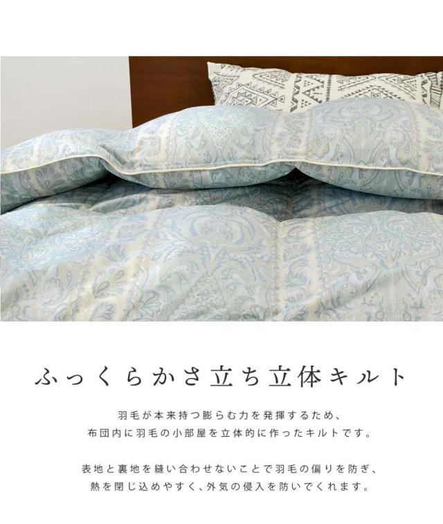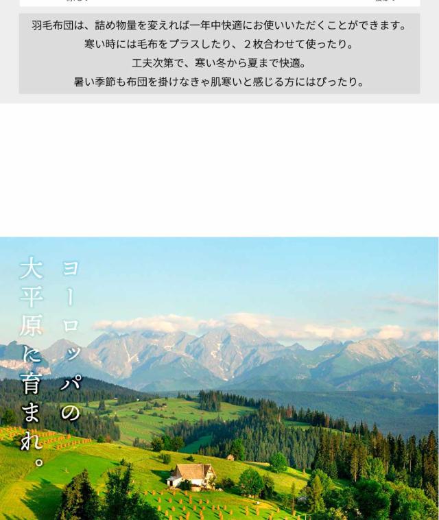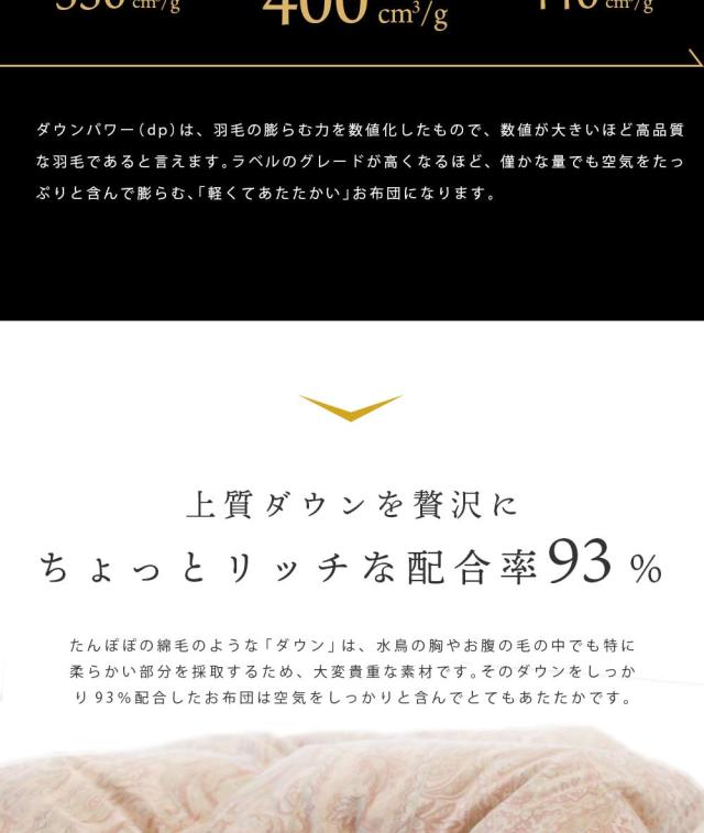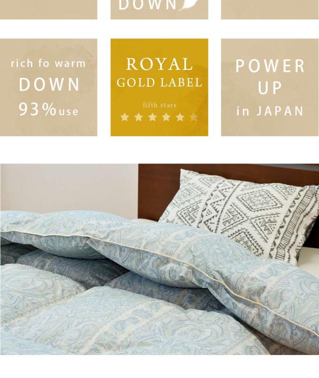| 仕様 | 立体キルト マス目(4×5) ループ8ヵ所 ポーランド産ホワイトダックダウン使用 詰め物重量0.8kg 400DP以上 ロイヤルゴールドラベル |