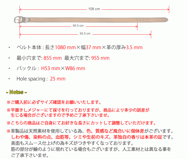 | ベルト長さ | 長さ108cm×幅3.7cm×革の厚み3.5mm 最小穴まで:85.5cm×最大穴まで:95.5cm ホールスパン:2.5cm |