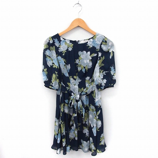 【中古】ダズリン dazzlin ワンピース 花柄 リボン 袖透け 丸首 五分袖 ひざ丈 S ネイビー 紺 /FT4 レディース