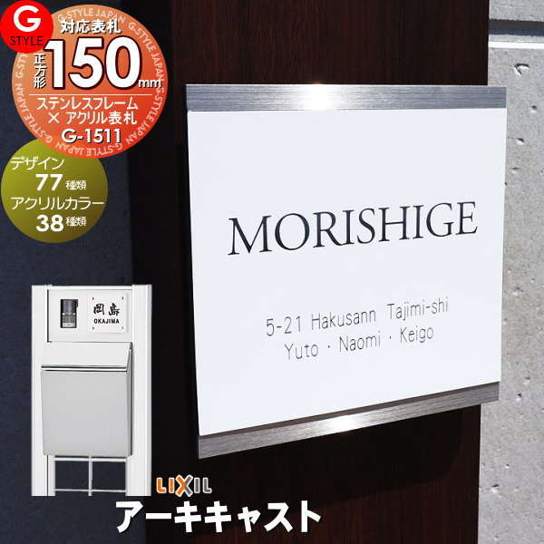 【表札 G-STYLE オリジナル】【アクリルガラス】【機能門柱】【機能ポール】 アーキキャストファンクション対応表札 【G-1511 150mm正方形-ステンレスフレーム×アクリルカラー表札】 【LIXIL】