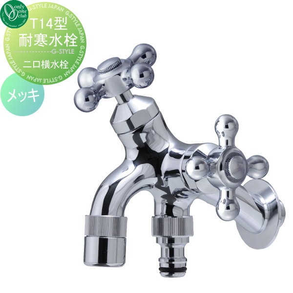 水栓柱 蛇口 補助蛇口 オンリーワンクラブ 【T14型耐寒水栓 二口横水栓 メッキ】 ガーデニング 庭まわり 水廻り 蛇口