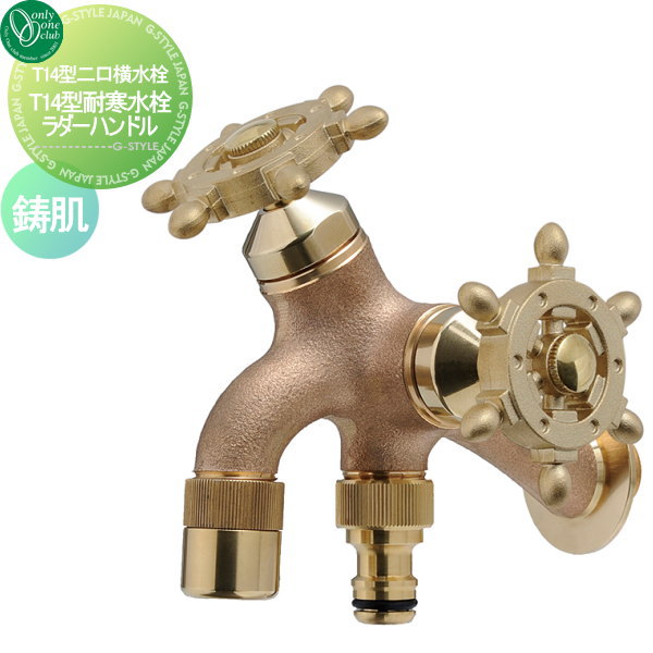 水栓柱 蛇口 補助蛇口 オンリーワンクラブ 【T14型二口横水栓 ラダーハンドル 鋳肌】 ガーデニング 庭まわり 水廻り 蛇口