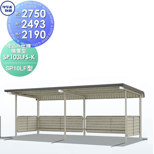 サイクルポート 自転車 置場 SP10LF型シリーズ 【柱間2750屋根奥行き2493高さ2190 埋込み仕様 積雪型 SP103LFS-K】※タクボ 駐輪 集合 雨よけ 雪よけ 6台用 ZAN仕様