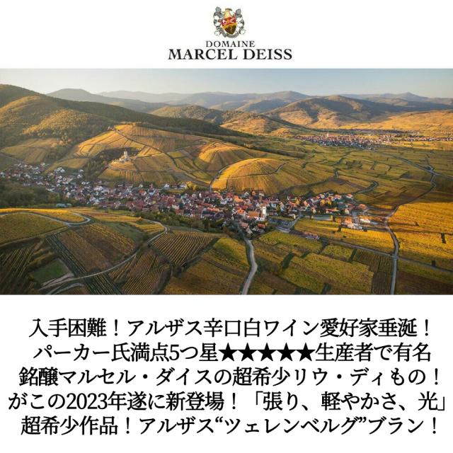 入手困難!アルザス辛口白ワイン愛好家垂涎!パーカー氏満点5つ星★★★★★生産者で有名銘醸マルセル・ダイスの超希少リウ・ディもの!がこの2023年遂に新登場!「張り、軽やかさ、光」超希少作品!アルザス“ツェレンベルグ”ブラン!