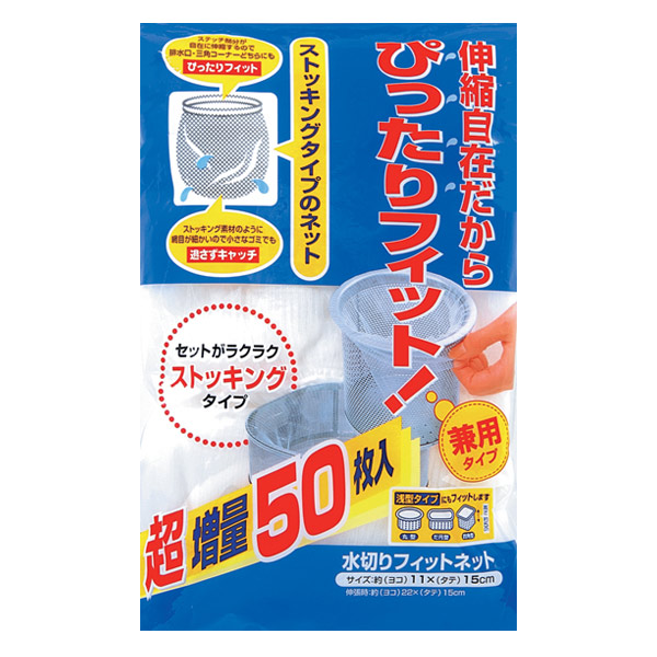 ●セットがラクラクなストッキングタイプの水切りネット、たっぷり使える50枚入りです。