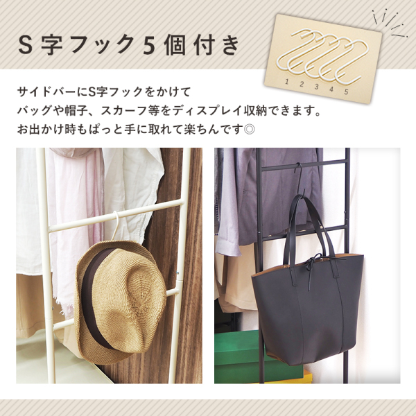 ・S字フック5個付きなので小物類もまとめて管理