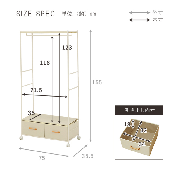 サイズ:(約)幅75×奥行35.5×高さ155cm