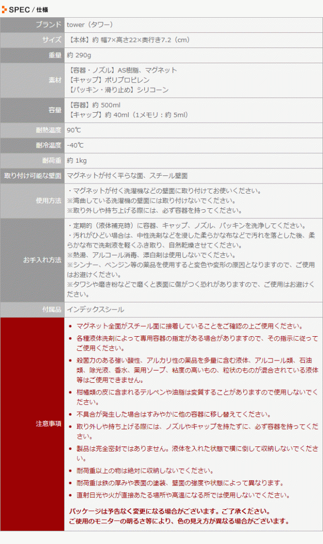 詰め替えボトル マグネット 洗濯洗剤用 ランドリーボトル tower タワー おしゃれ シンプル