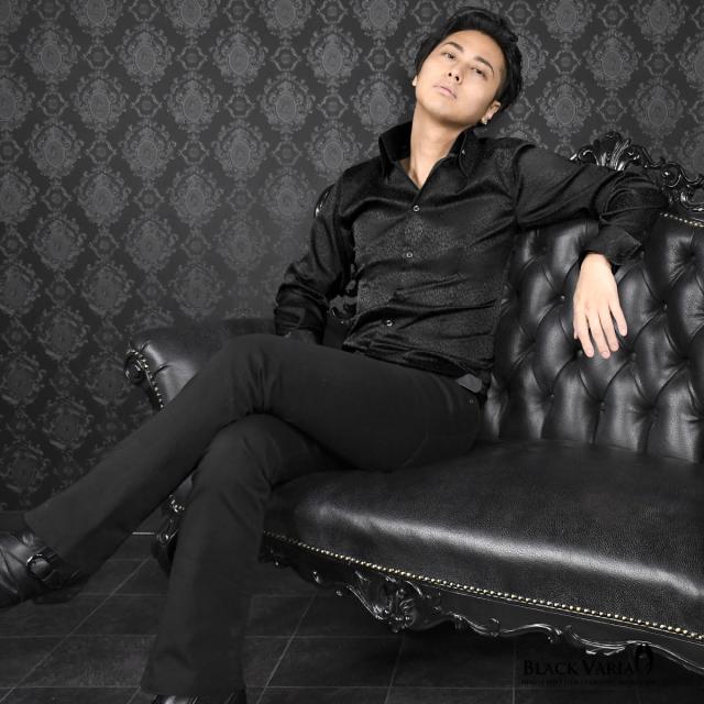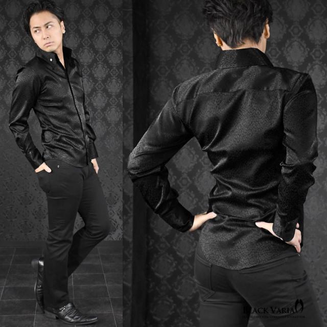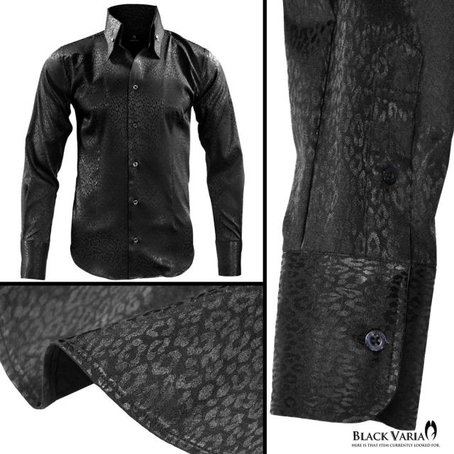 サテンシャツ スワロフスキー釦 ドレスシャツ スキッパー ヒョウ柄 豹柄 ジャガード ボタンダウン スリム 日本製(ブラック黒) 191853