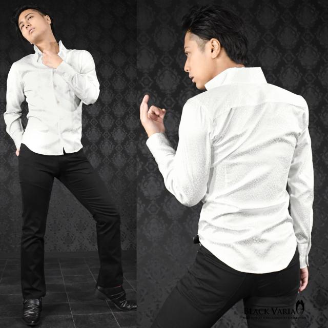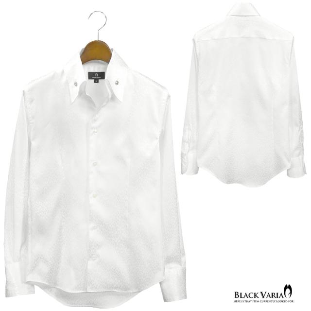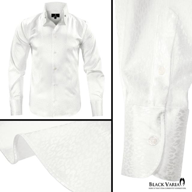 サテンシャツ スワロフスキー釦 ドレスシャツ スキッパー ヒョウ柄 豹柄 ジャガード ボタンダウン スリム 日本製(ホワイト白) 191853