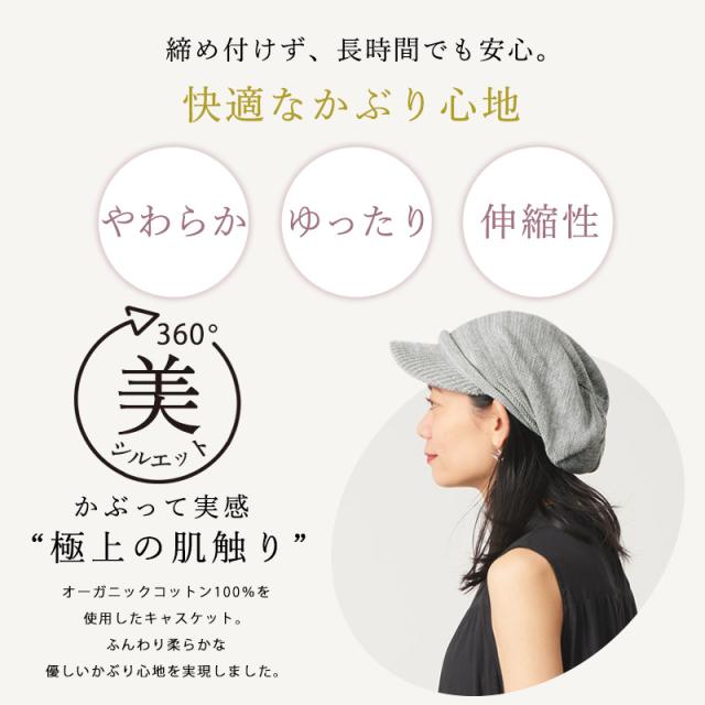 ニット素材のオーガニックコットンの糸を使用したキャスケット。