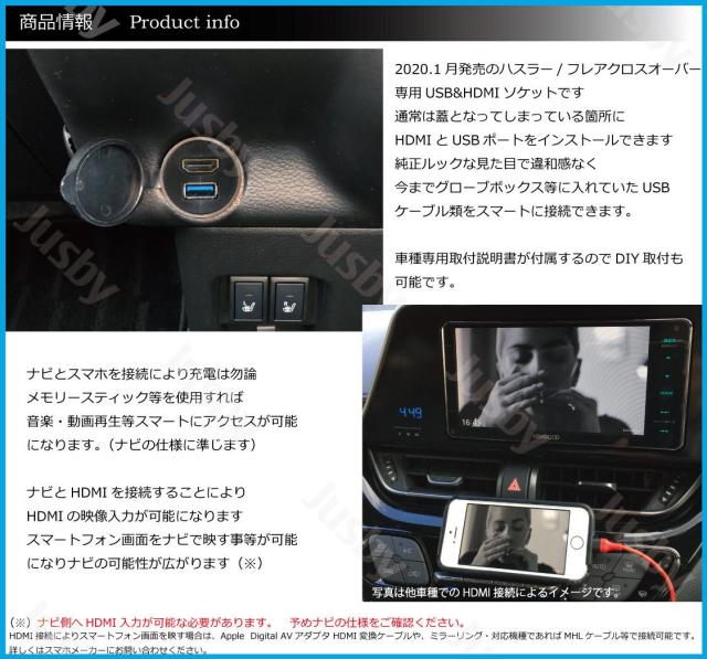 | スズキ スズキ 新型 ハスラー&フレアクロスオーバー専用 USB&HDMIソケット or DUAL USBソケットです スズキ 新型 ハスラー (MR52S / MR92S) 及び マツダフレアクロスオーバー (MS52S / MS92S) 専用のソケットセットです。 当キットで通常ナビからグローブボックス等にいれていたケーブルを類をスマートにインストールできます。 USB・HDMIケーブルはどちらも1mとなっておりナビまで余裕を持って届く長さとなっております。 DUAL USB or USB&HDMI のご希望の商品をお選びの上ご注文ください。 USBをナビと接続することによりUSBメモリー内の動画(mp4)や音楽再生(mp3)やスマートフォンと接続して充電や音楽再生、HDMIをナビと接続してスマートフォンの画面等をナビに映したり、ミラーキャスト、ミラーリング等ナビの可能性が広がります。 (※2020年度モデルナビの代表的な機能ですが、社外ナビの仕様によって異なる場合がありますので、予めナビの仕様をご確認ください) ナビの取付時などに同時作業されることをお勧めいたします。 ※ナビによって別途USB接続ケーブルやHDMI変換ケーブルが別途必要な場合がありますのでご注意下さい。 (当社でも一部社外ナビ用USBケーブルを販売しております) ( ・∀・)Φスタッフレビュー 純正ルックなソケットになるように設計しており純正の様な仕上がりで違和感無く取付可能です。 お客様からの要望の多かったUSB&HDMI と DUAL USBの2種類を追加設定させていただきました。 USB等をスマートに活用できますので非常におすすめです。 その他 2020年ハスラー専用パーツを多数出品しております。送料を抑えた同梱可能ですのでぜひ御覧ください |